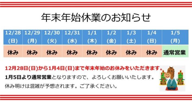 年末年始休業のお知らせ