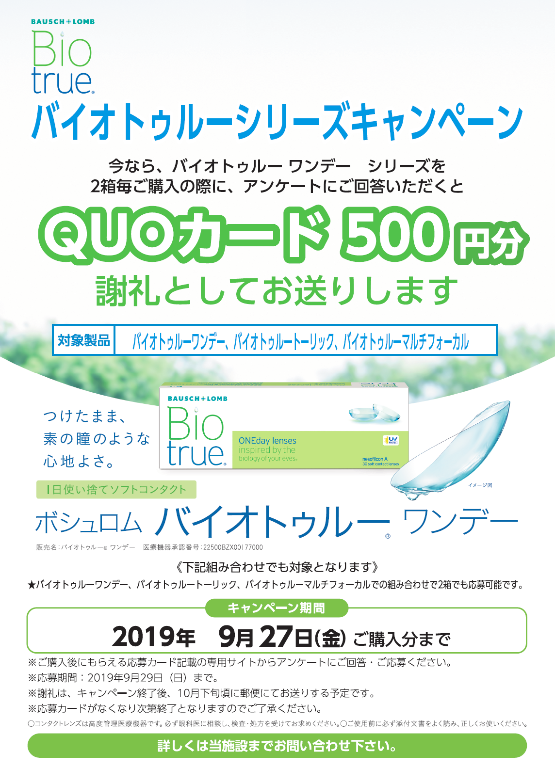 ※ 対象製品はバイオトゥルー3製品(近遠視用/乱視用/遠近両用)となります。 ※ ご購入後にもらえる応募カード記載の専用サイトからアンケートにご回答・ご応募ください。 ※ 応募期間 9月29日(日) ※ 謝礼は、キャンペーン終了後、10月下旬頃に郵便にてお送りする予定です。 ※ 応募カードは無くなり次第終了となりますのでご了承下さい。