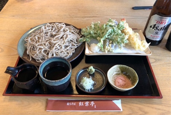 福島市飯坂町にある「紅葉亭」では“裁ち(たち)そば”が有名で、そばの由来は、何枚も重ねた麺生地を二等分に重ね、包丁で布を裁つように直角に断ち切ることからつけられたそうです。人気店だけあって到着時にはすでに大行列。期待に胸を膨らませ1時間ほど待ち、いざ入店。私は、皿そばと天ぷら、それに大好物のビールを注文しました。初めて食すおそばは、コシが強く食べごたえのある麺がつけだれによくからみ、サクサクの天ぷらとも相性がばっちりでした。ビールも美味しく飲めました。